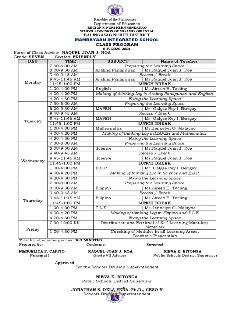 8:00-9:30 AM MAPEH Ms. Jennelyn G. Malayno