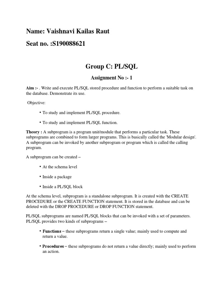 Aim :- . Write and execute PL/SQL stored procedure and function to perform a suitable task on