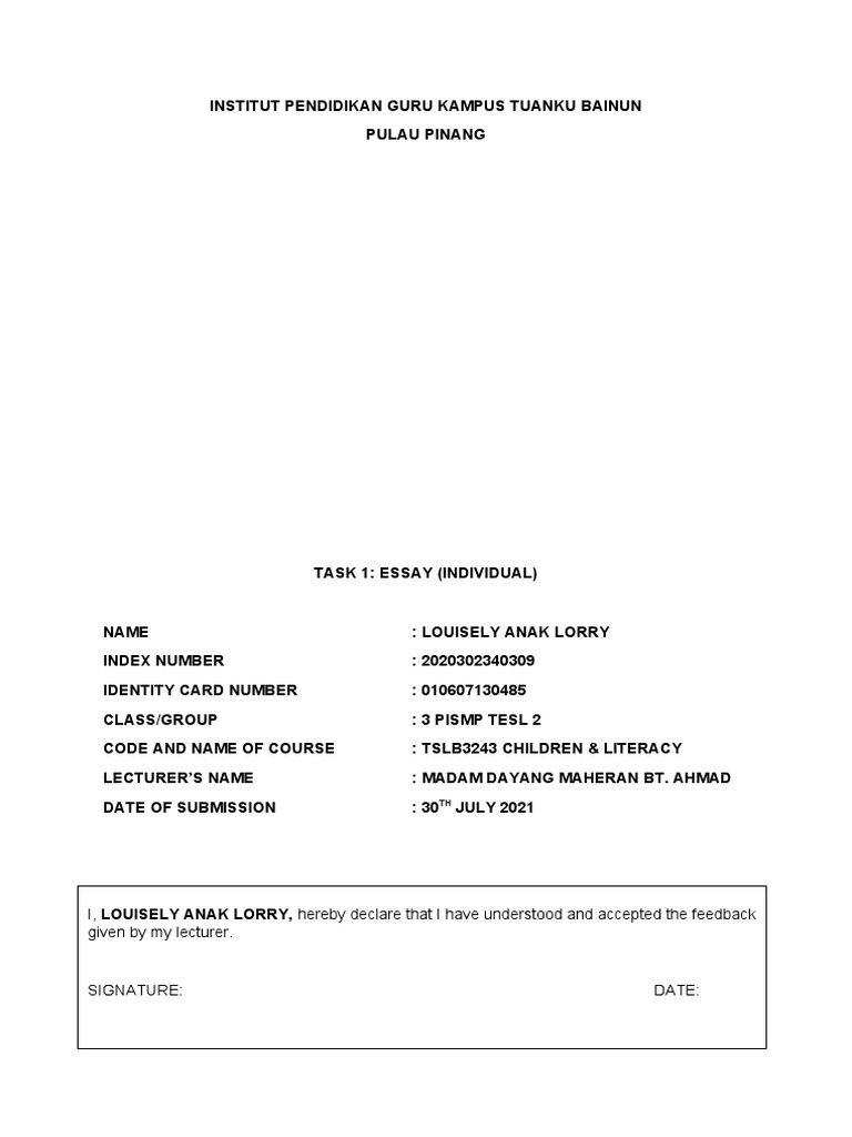 CODE AND NAME OF COURSE : TSLB3243 CHILDREN & LITERACY