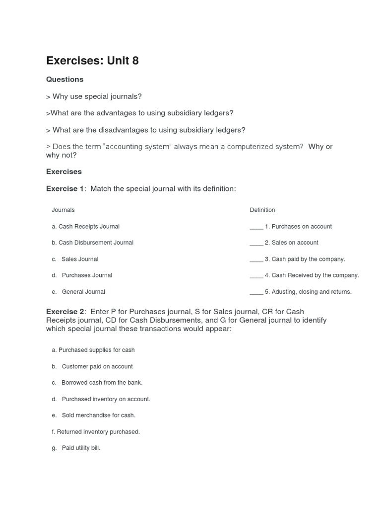 Exercise 2: Enter P for Purchases journal, S for Sales journal, CR for Cash