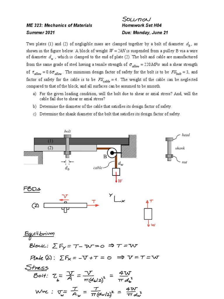 c) Determine the shank diameter of the bolt that satisfies its design factor of safety.
