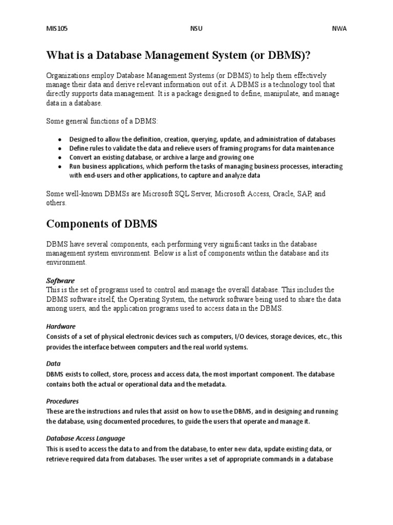 DBMS exists to collect, store, process and access data, the most important component. The database