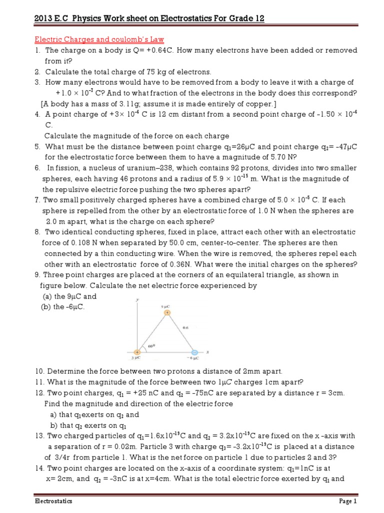 2013 E.C Physics Work sheet on Electrostatics For Grade 12