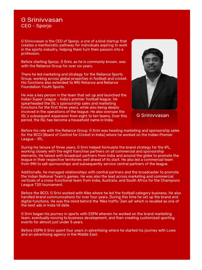 Before the BCCI, G Srini worked with Nike where he led the football category business. He also