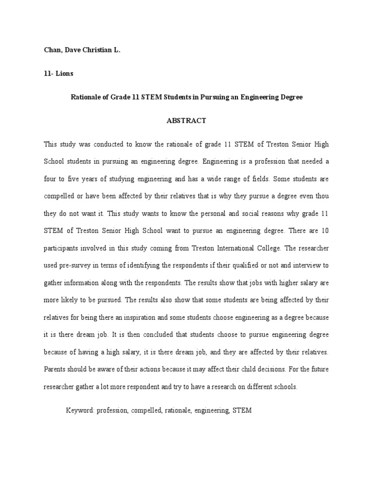 This study was conducted to know the rationale of grade 11 STEM of Treston Senior High