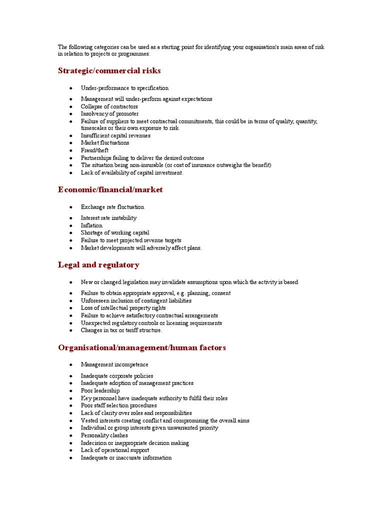 The following categories can be used as a starting point for identifying your organisation's main areas of risk