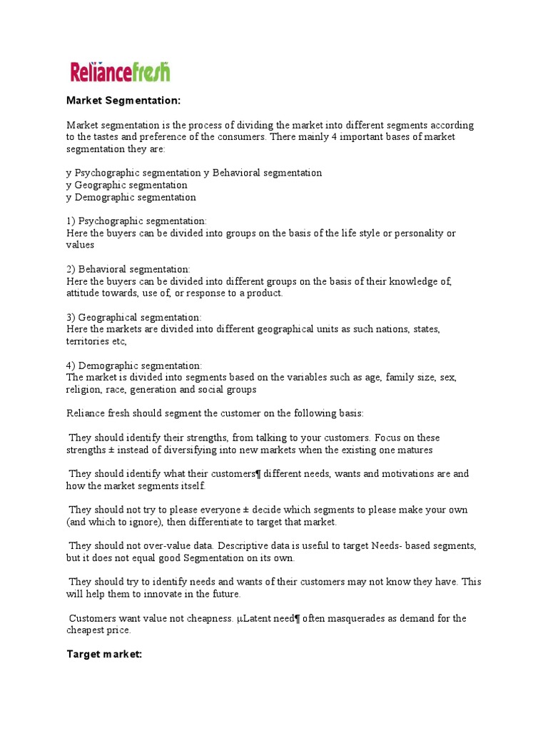 Reliance fresh should segment the customer on the following basis: