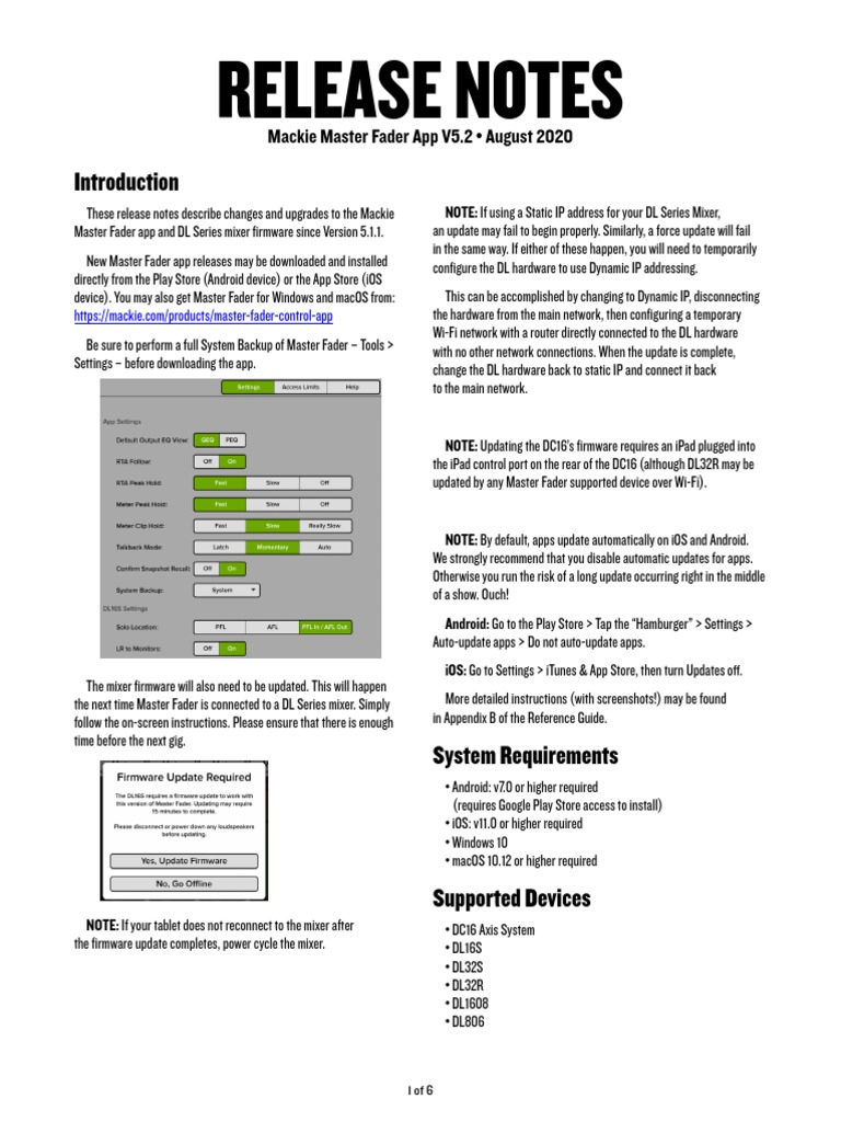 These release notes describe changes and upgrades to the Mackie NOTE: If using a Static IP address for your DL Series Mixer,