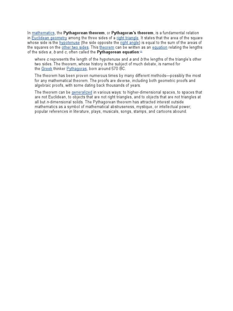 mathematics, the Pythagorean theorem, or Pythagoras's theorem, is a fundamental relation