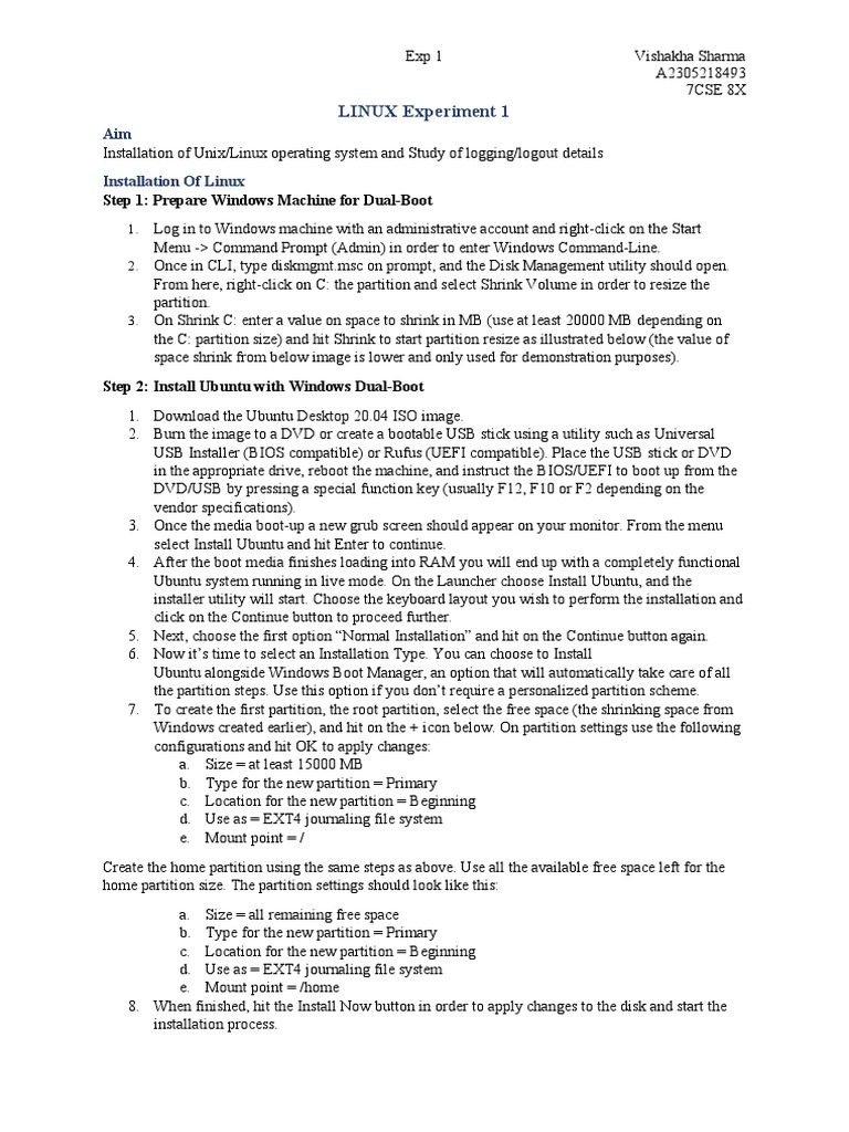 Installation of Unix/Linux operating system and Study of logging/logout details