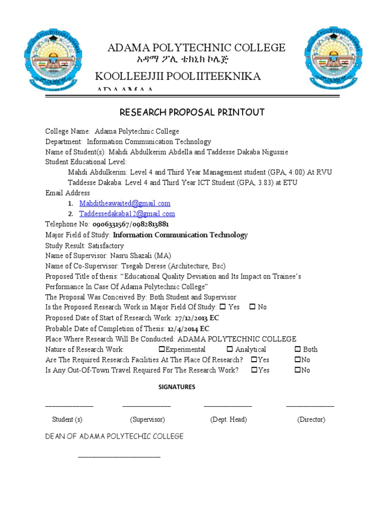 Place Where Research Will Be Conducted: ADAMA POLYTECHNIC COLLEGE