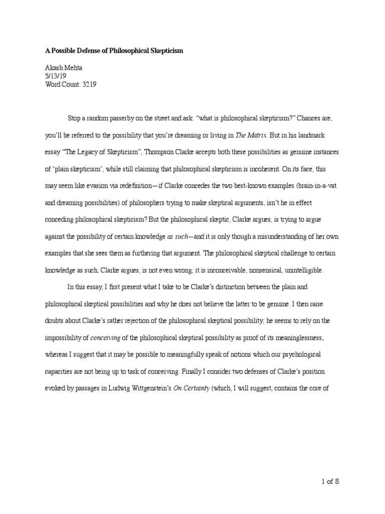 philosophical skeptical possibilities and why he does not believe the latter to be genuine. I then raise