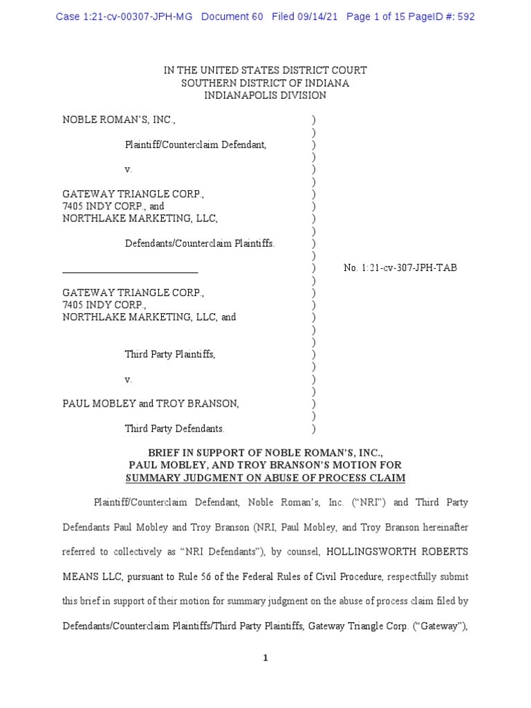 BRIEF IN SUPPORT OF NOBLE ROMAN’S, INC.,