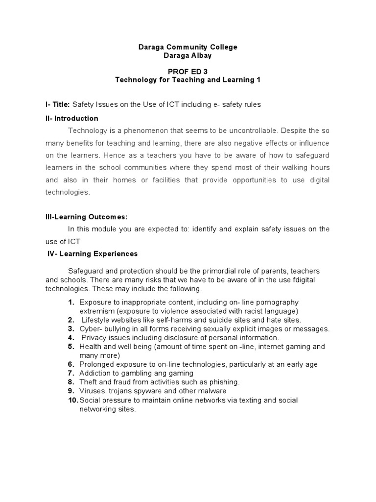 I- Title: Safety Issues on the Use of ICT including e- safety rules
