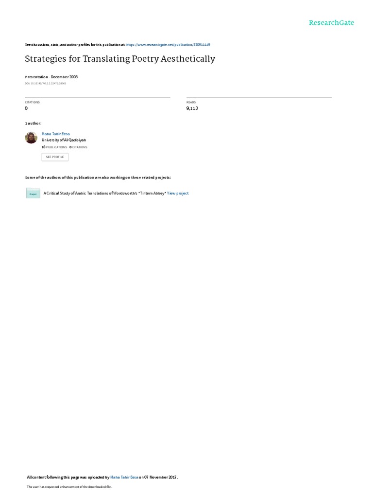 A Critical Study of Arabic Translations of Wordsworth's "Tintern Abbey" View project