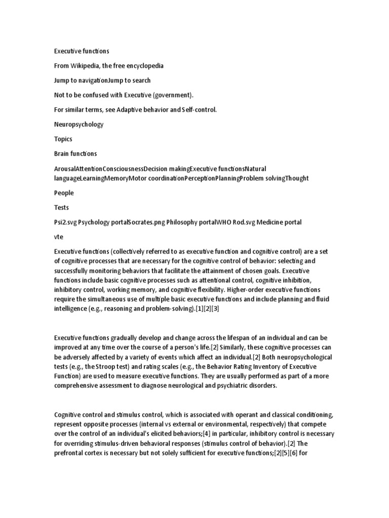 Executive functions (collectively referred to as executive function and cognitive control) are a set