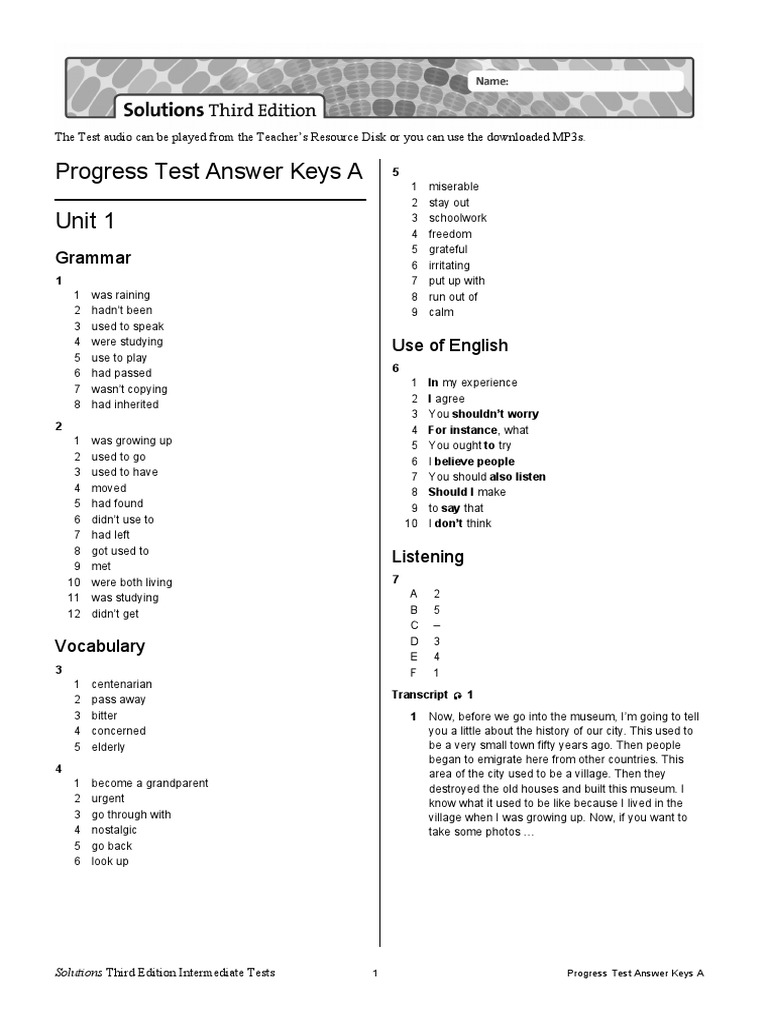 Solutions Third Edition Intermediate Tests 1 Progress Test Answer Keys A