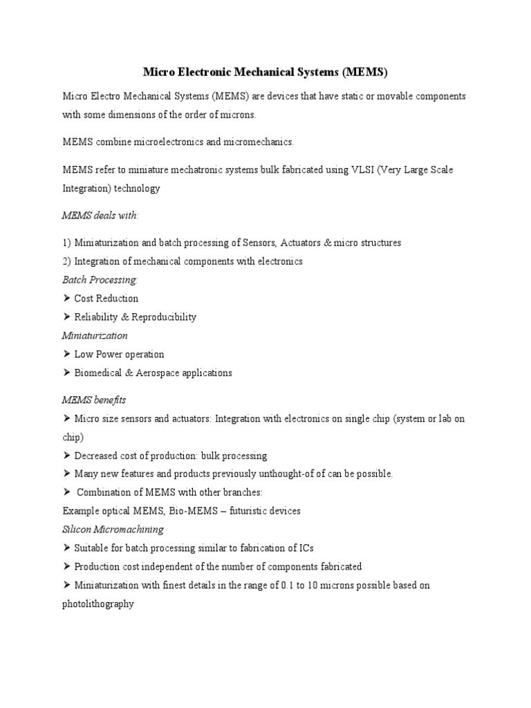 1) Miniaturization and batch processing of Sensors, Actuators & micro structures