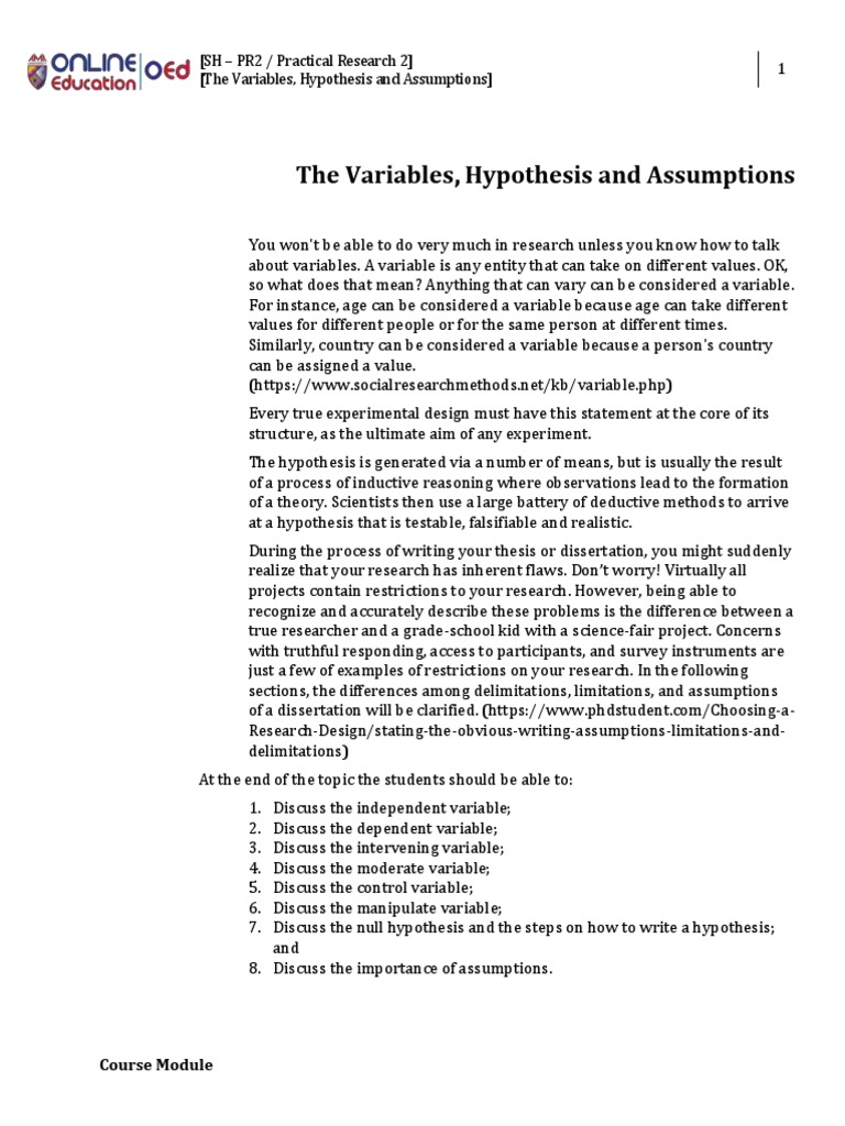 The Variables, Hypothesis and Assumptions