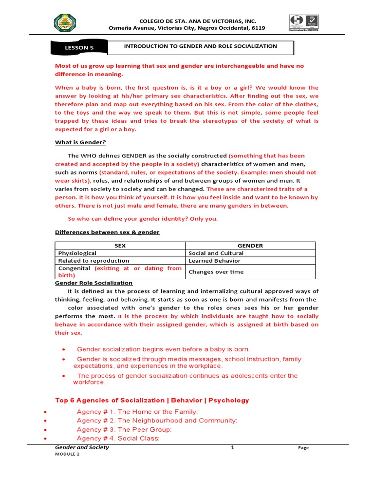 LESSON 5 INTRODUCTION TO GENDER AND ROLE SOCIALIZATION