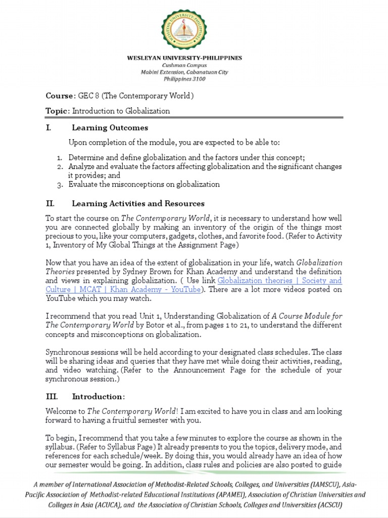 I recommend that you read Unit 1, Understanding Globalization of A Course Module for