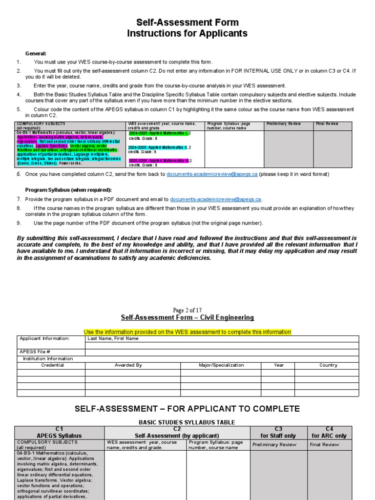6. Once you have completed column C2, send the form back to documents-academicreview@apegs.ca (please keep it in word format)