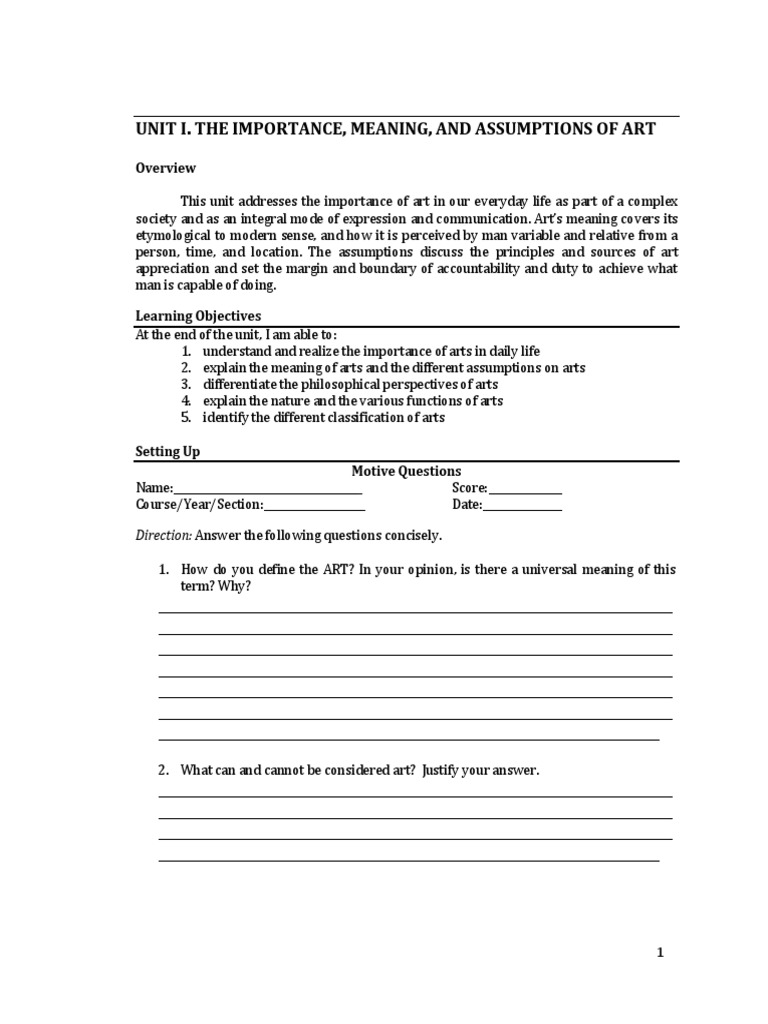 THE IMPORTANCE, MEANING, AND ASSUMPTIONS OF ART