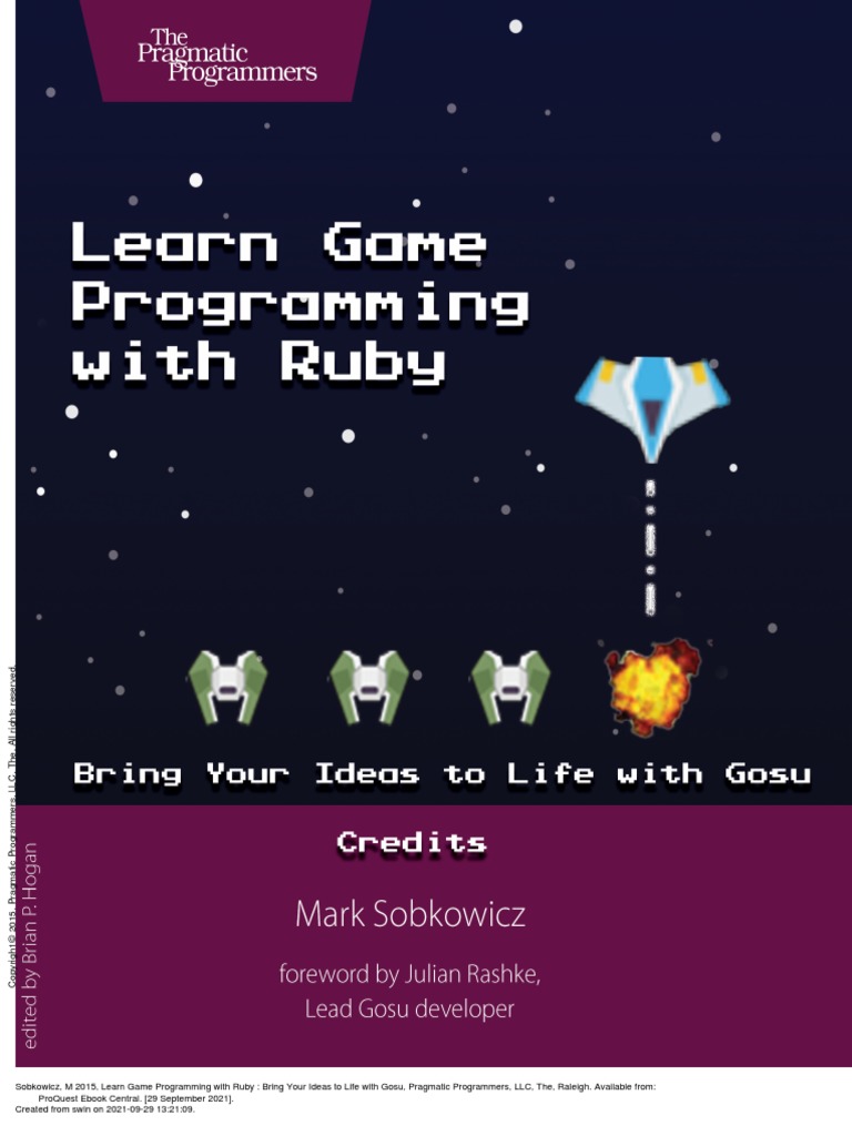 Sobkowicz, M 2015, Learn Game Programming with Ruby : Bring Your Ideas to Life with Gosu, Pragmatic Programmers, LLC, The, Raleigh. Available from:
