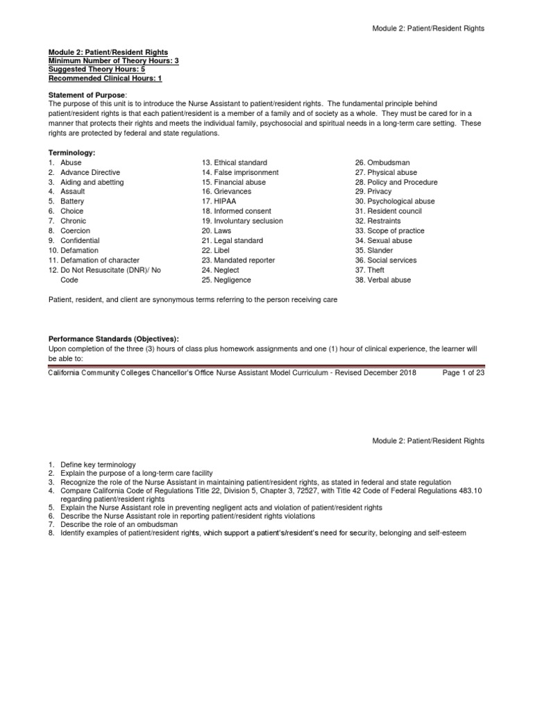 Module 2: Patient/Resident Rights Minimum Number of Theory Hours: 3 Suggested Theory Hours: 5 Recommended Clinical Hours: 1 Statement of Purpose
