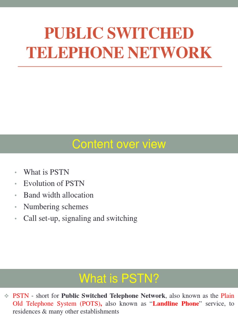 • The Public Switched Telephone Network, or PSTN, is the worldwide