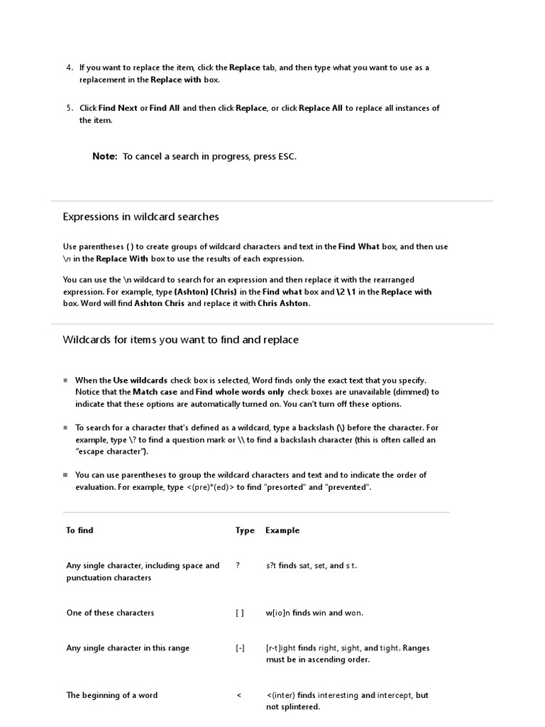 Use parentheses ( ) to create groups of wildcard characters and text in the Find What box, and then use