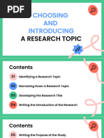 The document provides guidance on developing a research problem and identifying an area of inquiry. It discusses several key steps, including brainstorming potential topics, thoroughly researching those topics by reading literature, and analyzing how variables may be related within topics. The document emphasizes choosing a topic you are interested in that also has available research and resources. It advises describing topics briefly and formulating a working title to help focus the direction of your study. The overall process helps ensure your research problem and area of inquiry are specific, relevant, and can feasibly be studied.