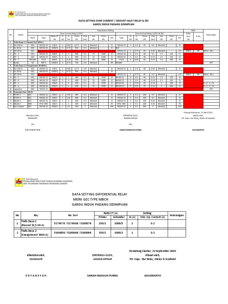 DATA SETTING OVER CURRENT / GROUNT FAULT RELAY & SEF