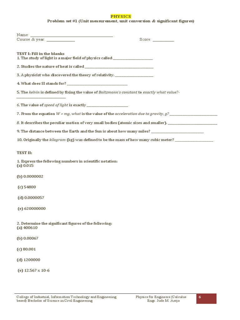 Problem set #1 (Unit measurement, unit conversion & significant figures)