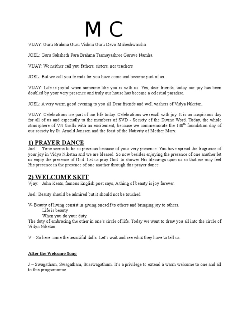 JOEL: A very warm good evening to you all Dear friends and well wishers of Vidya Niketan.
