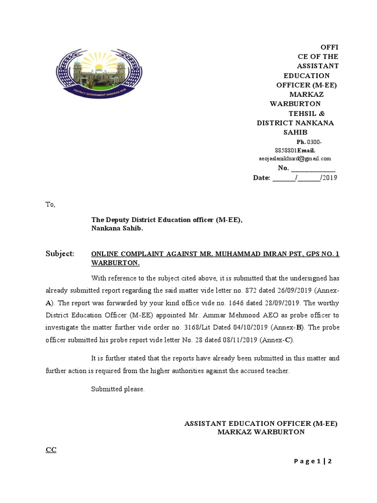 Subject: ONLINE COMPLAINT AGAINST MR. MUHAMMAD IMRAN PST, GPS NO. 1