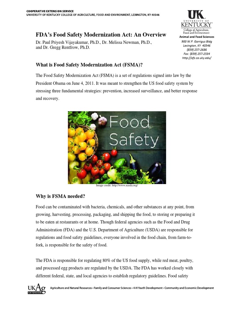 FDA’s Food Safety Modernization Act: An Overview Animal and Food Sciences