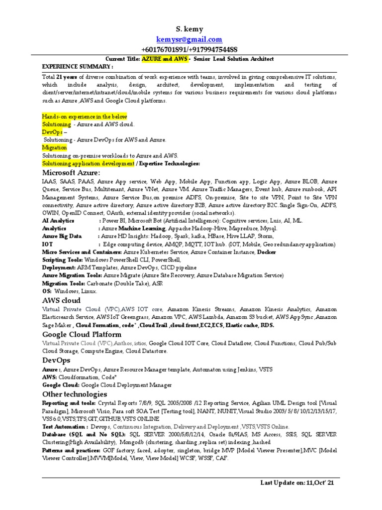 Current Title: AZURE and AWS - Senior Lead Solution Architect