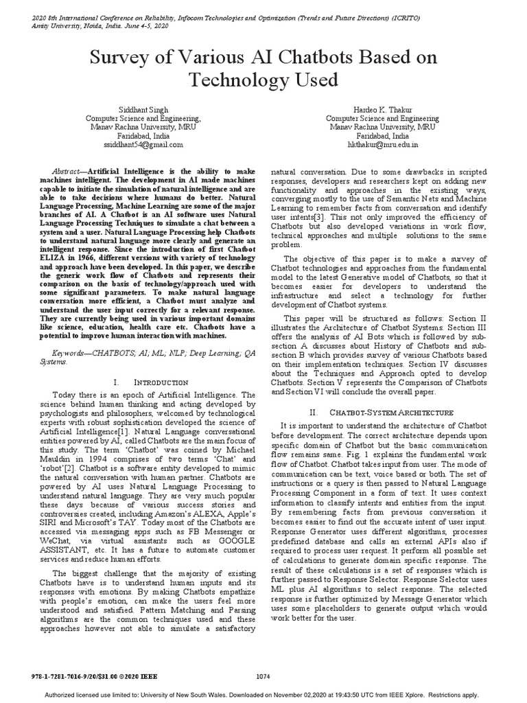 Survey of Various AI Chatbots Based On Technology Used: Abstract-Artificial Intelligence Is The Ability To Make