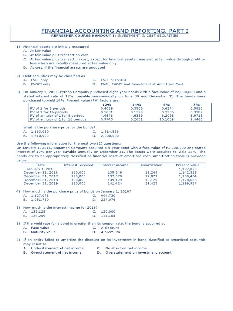 REFRESHER COURSE HANDOUT 1: INVESTMENT IN DEBT SECURITIES