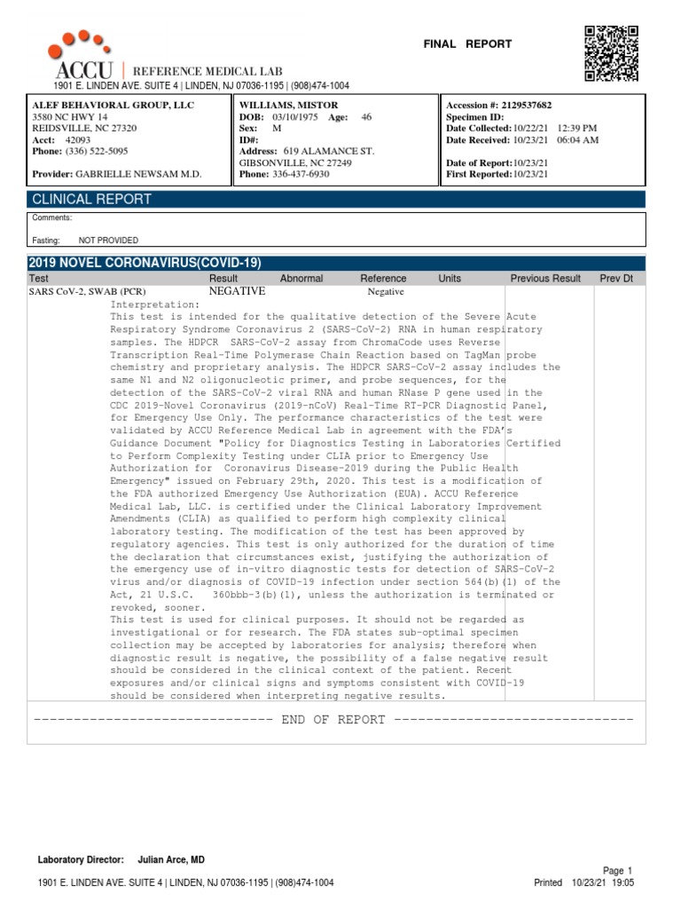 REIDSVILLE, NC 27320 Sex: M Date Collected:10/22/21 12:39 PM