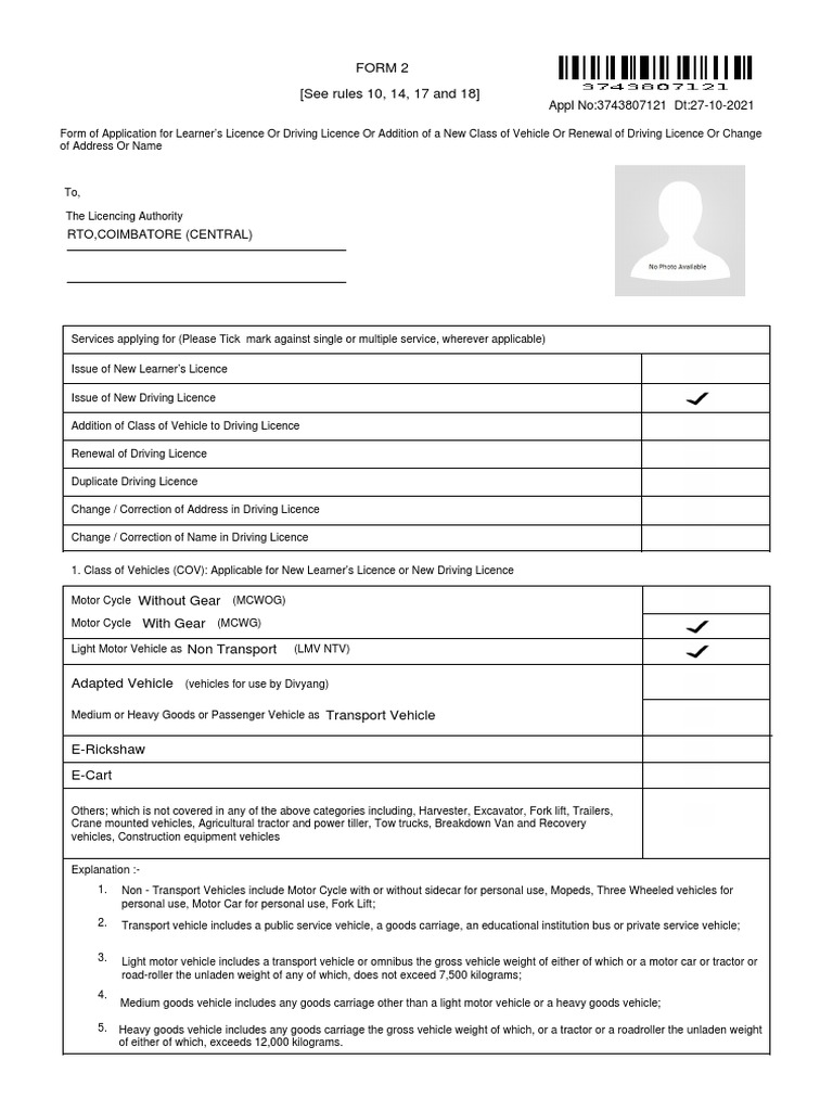 1. Class of Vehicles (COV): Applicable for New Learner’s Licence or New Driving Licence
