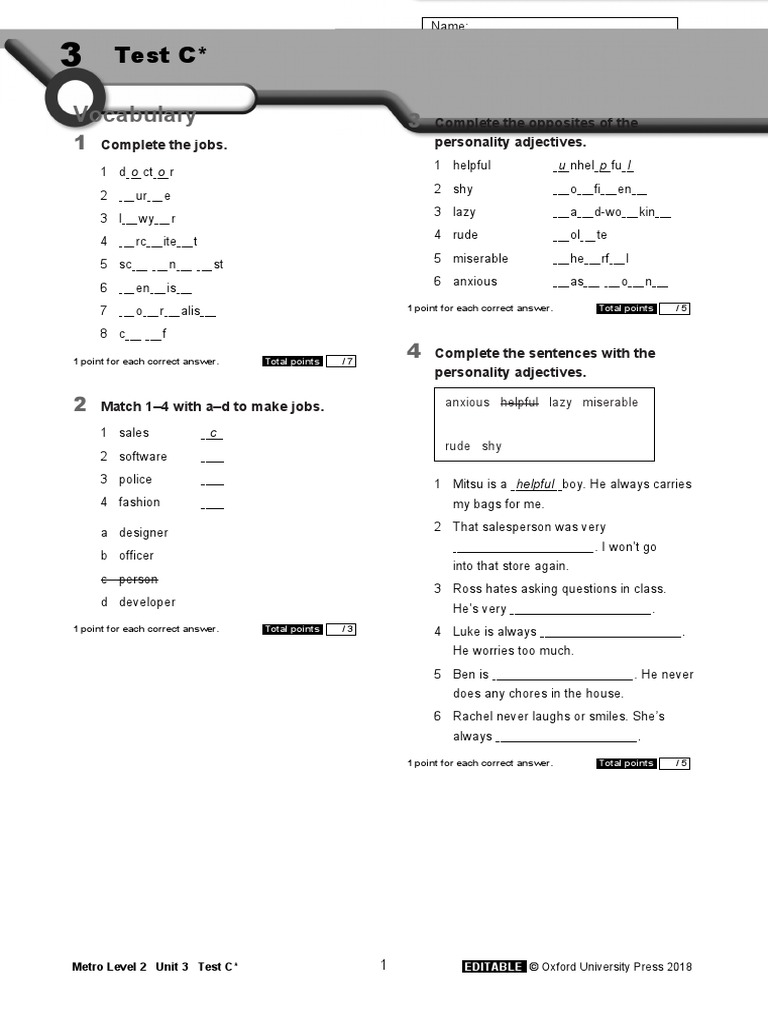 Metro Level 2 Unit 3 Test C* 2 EDITABLE © Oxford University Press 2018