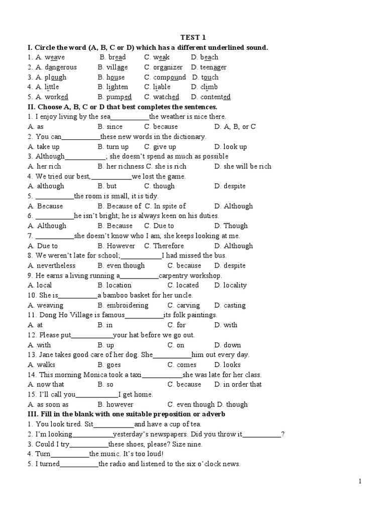 I. Circle the word (A, B, C or D) which has a different underlined sound.
