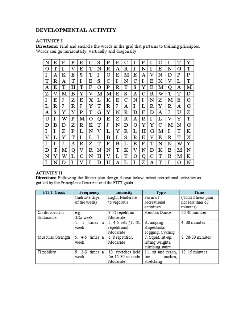 Directions: Following the fitness plan design shown below, select recreational activities as