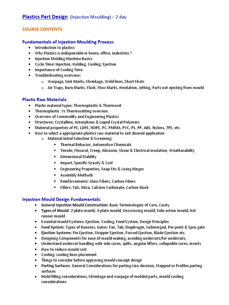 o Designing for avoiding defects like; sink marks, Burn marks, warpage etc