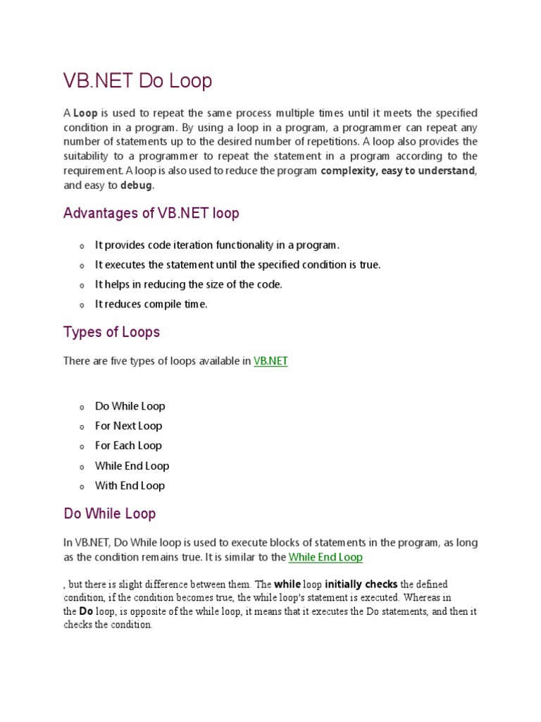 In VB.NET, Do While loop is used to execute blocks of statements in the program, as long