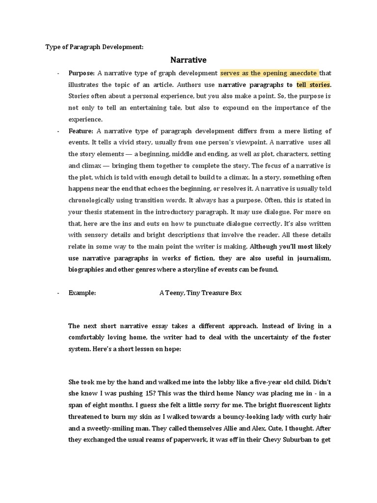 - Feature: A narrative type of paragraph development differs from a mere listing of