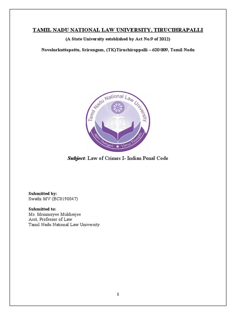 Law, Tamil Nadu National Law University, Tiruchirappalli - 620 027. This work has not