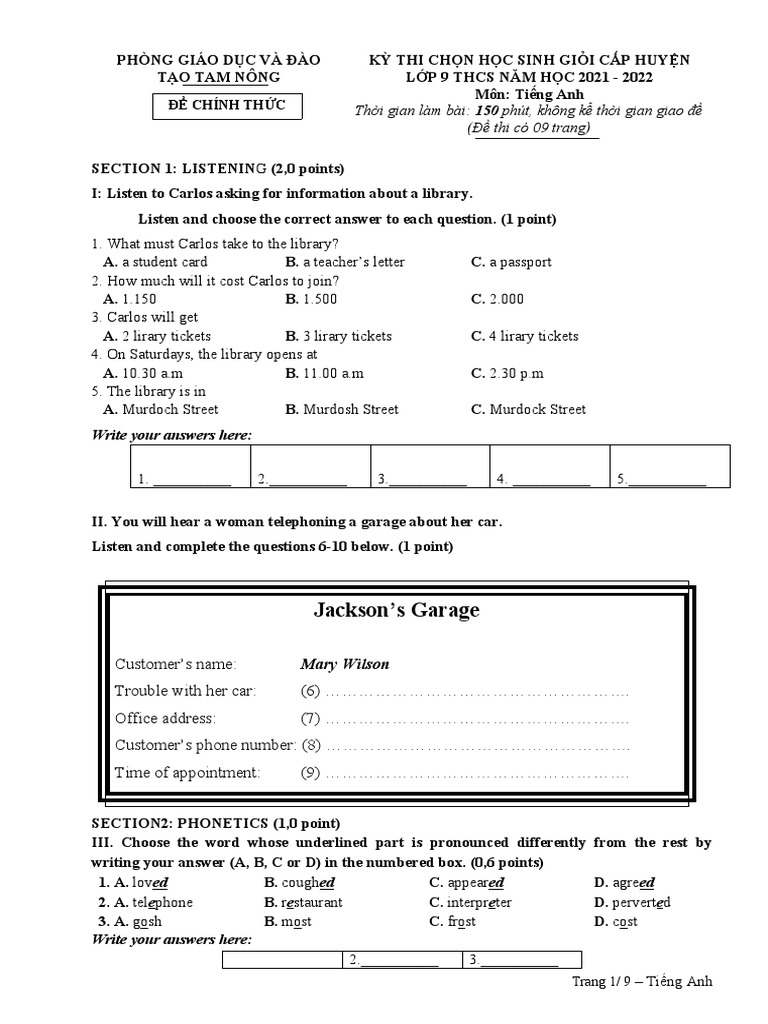 TẠO TAM NÔNG LỚP 9 THCS NĂM HỌC 2021 - 2022